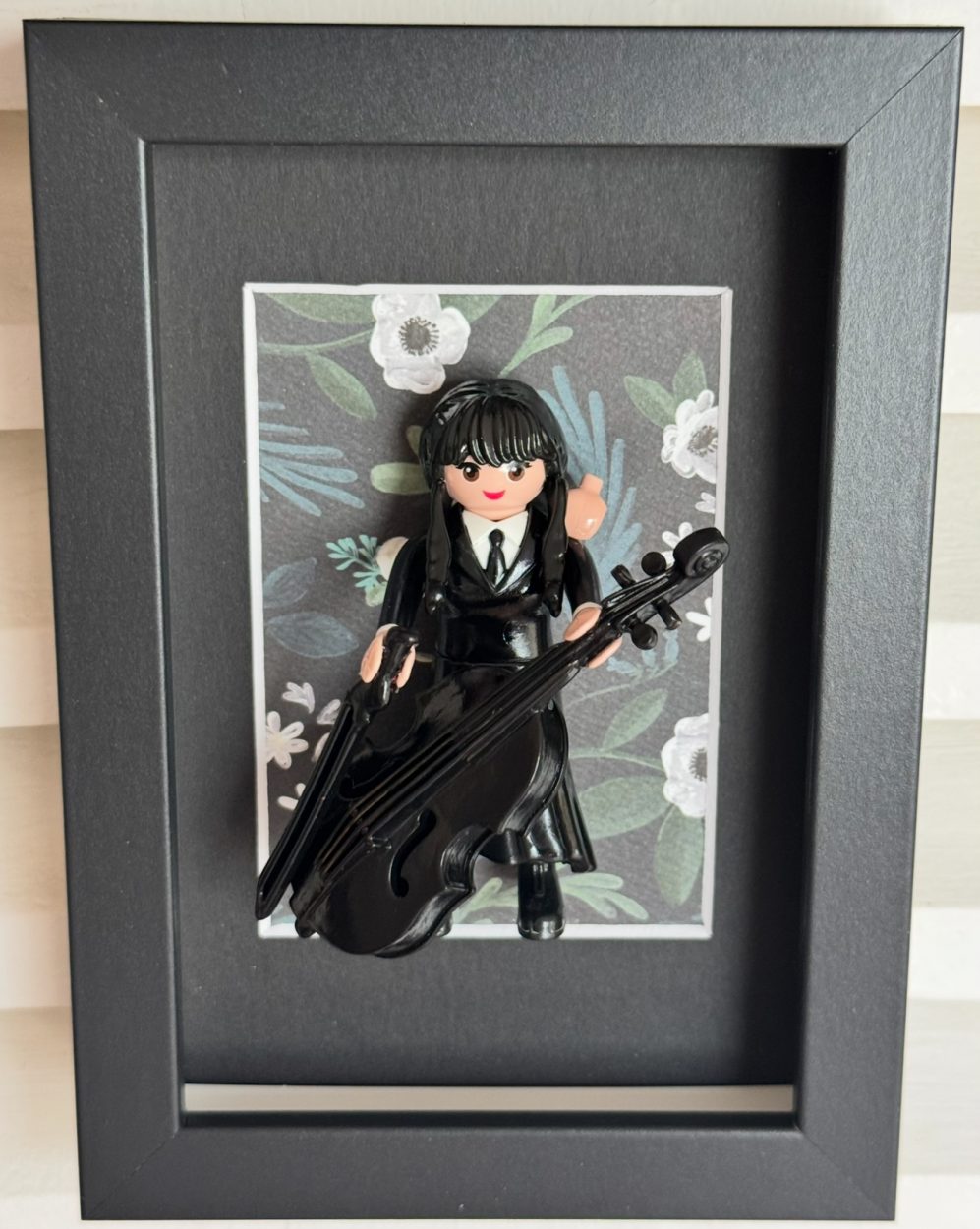 Dimensions de l’œuvre : 10 x 15 cm, avec une profondeur de 3 cm. L’encadrement en panneau de fibres de bois noir ajoute une touche d’élégance et peut être personnalisé selon vos envies. Que vous choisissiez de l’exposer sur une table ou de l’accrocher au mur, cette pièce apportera une note décalée à votre décoration.