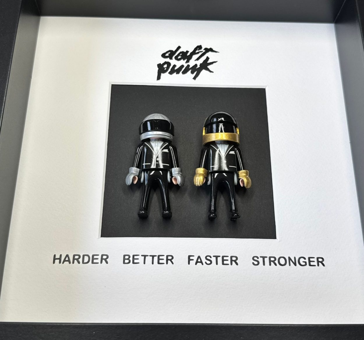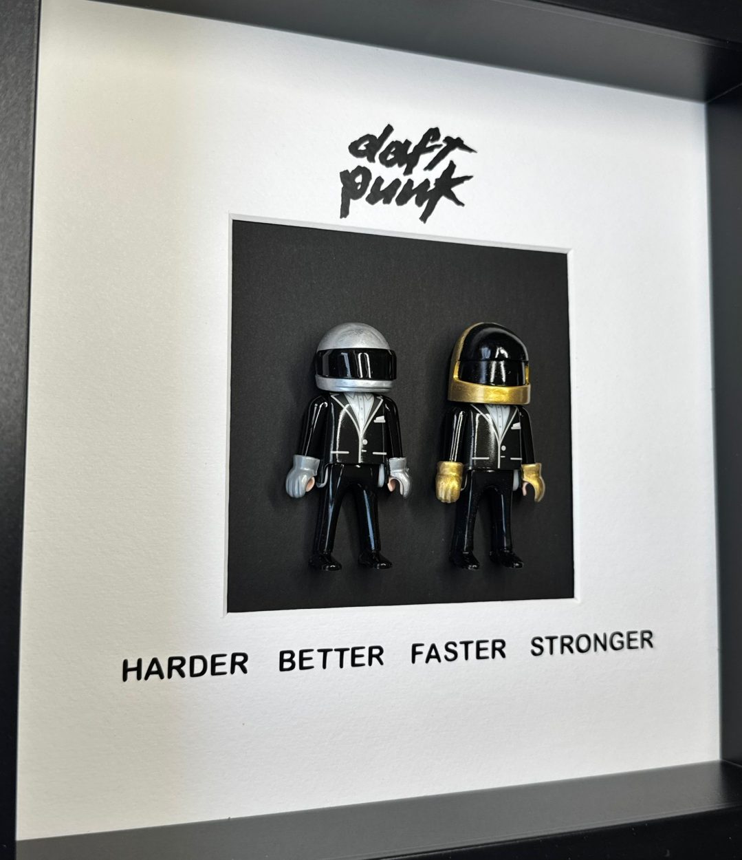 Dimensions de l’œuvre : 25 x 25cm, avec une profondeur de 3 cm. L’encadrement en panneau de fibres de bois noir ajoute une touche d’élégance et peut être personnalisé selon vos envies. Que vous choisissiez de l’exposer sur une table ou de l’accrocher au mur, cette pièce apportera une note décalée à votre décoration.